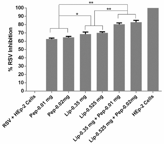 Screening of peptide, liposomes, and peptide encapsulated against respiratory syncytial virus (RSV). Plaques were counted, and the mean plaque was a count of each sample, which was expressed as a percentage of the mean count of the control. (n = 3 ± SD). Significant differences between the samples represented as * p < 0.05 and ** p < 0.01.