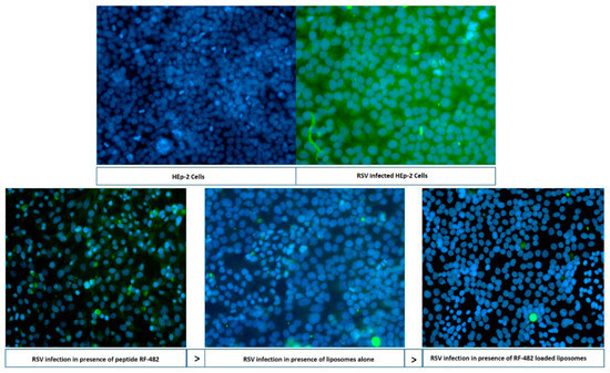 Fluorescence microscopy analysis. FITC (green)—RSV; and DAPI (blue)—HEP-2 cell nucleus. In liposomes and RF-482 liposomes, the blue color represents the survived cells, and the green color represents the presence of RSV.