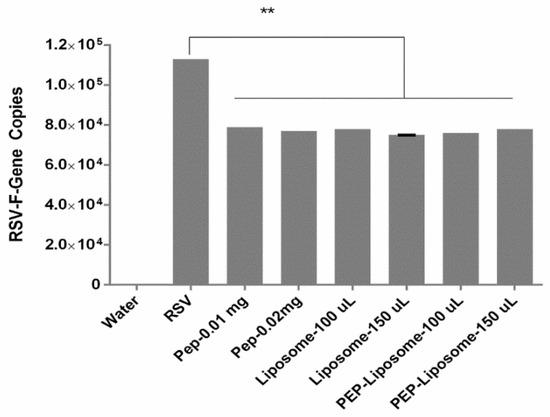 Screening of the RSV-F gene amplicon dilution with water as negative control. Comparison of viral gene amplicon and peptide, liposomes, and peptide-loaded liposomes. (n = 3 ± SD). Significant difference between the samples represented as ** p < 0.01.