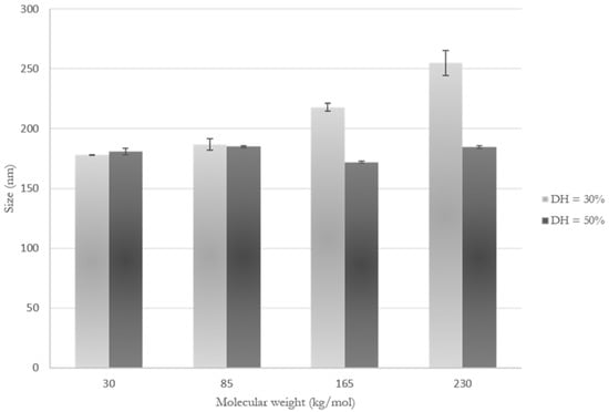 Hydrodynamic diameter of MC-g-PNtBAm nanogels varying the MC molecular weights at two different degrees of hydrophobization (DH), measured by particle tracking analysis. Three measurements were made, with the error bars corresponding to the standard deviation of the mean size.
