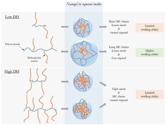 The impact of hydrophobization has been previously reported to depend on the size of the polysaccharide chain [,]. This is likely due to the ratio between the length of the hydrophobic side chains relative to the length of the hydrophilic segment between each side chain. When in water, longer hydrophilic MC chains are able to expand to take up and trap water while still maintaining the cohesion of the nanogel mesh, as illustrated in Figure 2; shorter chains do not create a mesh able to swell sufficiently to hold water molecules. However, at higher DH, the crosslinking density prevents volume change of the hydrophilic chains, making a mesh that is too tight to expand, so the molecular weight of MC no longer has an impact.
