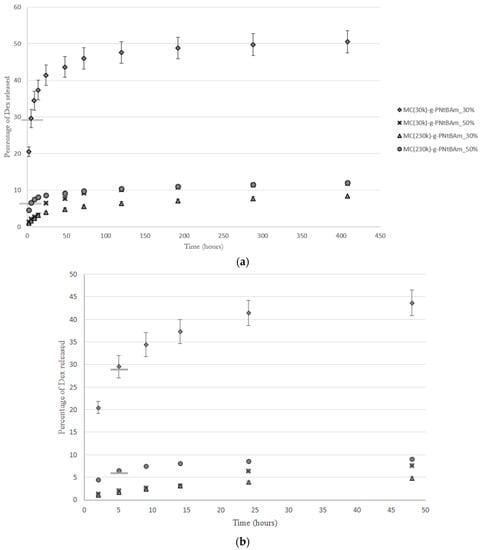 As previously observed [], higher hydrophobic content induced higher loading efficiencies, due to stronger hydrophobic associations and/or the presence of increased hydrophobic domains (Table 3). The three-phase release observed was in accordance with the previous study on MC-g-PNtBAm nanogels [] (Figure 4). An initial burst stage attributed to the drug soaked in the outer hydrophilic part of the aggregates is followed by a second slower diffusion phase corresponding to the dexamethasone that is more deeply entrapped. The final plateau stage is attributed to the high affinity of dexamethasone with the hydrophobic PNtBAm side chains [].