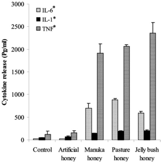 Honeys induce monocyte inflammation response. IL-6, IL-1, and TNF release from peripheral blood monocytes over 18 h in the presence of artificial honey (syrup control), Manuka honey, Pasture honey, and Jelly Bush honey. “*” indicates statistical significance (p < 0.001, analyzed by ANOVA with a Tukey pair-wise comparison). Reproduced with permission from Tonks et al., Cytokine; published by Elsevier, 2003.