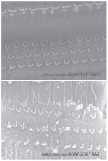 Undiluted honey damages cilia. (Top) SEM of saline-exposed chinchilla cochlea, in which normal inner and outer hair cells are observed. (Bottom) SEM of honey-exposed chinchilla cochlea in which the inner and outer hair cells have been damaged. Reproduced with permission from Aron et al., Otolaryngology—Head & Neck Surgery; published by BMC, 2012.