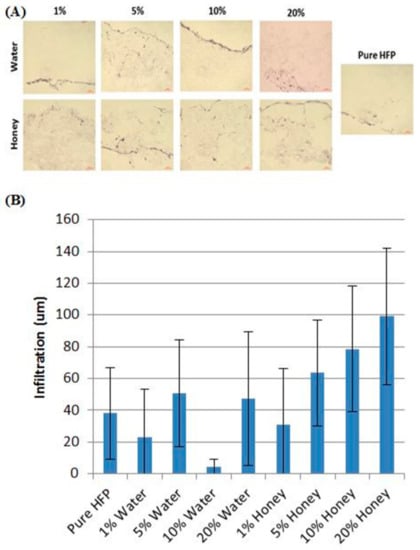 A more in-depth study of Manuka honey in electrospun templates was published by Minden-Birkenmaier et al. in 2015. In this study, solutions of poly(ε-caprolactone) (PCL), 1,1,1,3,3,3-hexafluoro-2-propanol (HFP), and various concentrations of Manuka honey were electrospun into fibrous templates which were then characterized with regards to fiber morphology, water vapor transmission rate (WVTR), permeability, mechanical properties, honey release, fibroblast response, and bacterial inhibition. Templates were also created replacing the Manuka honey with equivalent amounts of water to use as morphological controls. By sonicating the Manuka honey in the HFP before adding the PCL, and then electrospinning the resulting solution within 24 h, templates were created with equivalent fiber diameters, varying from 2 µm to 3.5 µm in diameter, up to a 20% v/v honey content. The water vapor transmission rate after a one-hour soaking period increased with increasing honey content, as did template permeability. Honey incorporation caused a decrease in the elastic moduli and peak stress of the templates, but there was no significant change in these properties over a 28-day soaking period. Glucose assays indicated that while up to 80% of the honey content of the templates was lost during a one-hour ethanol disinfection soak, the templates retained enough honey that they released significant amounts of honey over the following 24-h period of soaking, proportional to the amount incorporated into the scaffold. Fibroblast chemotaxis assays showed no effect of honey content in inducing chemotaxis towards the templates, indicating that the honey left in the templates to be released after the disinfection step is probably too low of an amount to induce chemotaxis. However, the 20% honey templates caused a significant increase in fibroblast proliferation and infiltration over PCL controls, indicating the potential of Manuka honey to improve template-tissue integration and regeneration (Figure 3). Bacterial inhibition studies of E. coli and S. agalactiae showed significant inhibition of both bacterial types by the 10% and 20% honey templates as expected due to the antibacterial properties discussed earlier, although this inhibition was significantly less than that of a sterile disc swabbed with pure Manuka honey. Together, these findings indicate the potential benefit of Manuka honey in improving cellular proliferation, cellular ingrowth, and bacterial inhibition associated with a tissue template []. However, the fact that 80% of the incorporated Manuka honey was removed during ethanol disinfection indicates that future studies may consider investigating core-shell electrospinning to protect the honey from leaching out during disinfection and provide for a more long-term, controlled release period. Other disinfection or sterilization methods, like gamma irradiation, should also be investigated as alternatives that may remove less of the incorporated honey.
