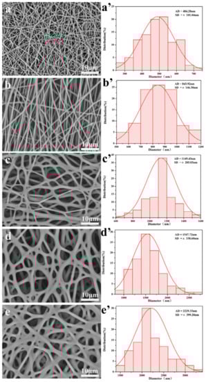 Honey increases fiber diameter. SEM images and histograms of fiber diameters of silk/PEO nanofibrous matrices spun with (a,a’) no Manukah honey; (b,b’) 10% w/v Manuka honey; (c,c’) 30% w/v Manuka honey; (d,d’) 50% w/v Manuka honey; and (e,e’) 70% w/v Manuka honey. Reproduced with permission from Yang et al., Materials & Design; published by Elsevier, 2017.