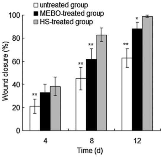 Honey hydrogel induces wound closure. Wound closure rates in rabbit wounds that were untreated, treated with a commercial wound ointment (MEBO), or treated with a honey-infused chitosan/gelatin hydrogel (HS) at 4, 8, or 12 days after beginning of treatment. “**” indicates statistical significance at p < 0.005, “*” indicates statistical significance at p < 0.01. Reproduced with permission from Wang et al., Carbohydrate Polymers, published by Elsevier, 2012.