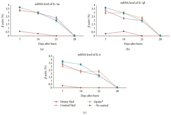 Giusto et al. have conducted research incorporating Manuka honey into pectin-based hydrogels. They report that honey-containing pectin hydrogels have superior bacterial clearance of S. aureus and E. coli, and demonstrate no cytotoxicity to fibroblasts [,]. Another study was conducted by Zhodi et al. in which Gelam honey, a honey produced in Malaysia, was incorporated into hydrogels made from polyvinyl pyrrolidone (PVP) and polyethylene glycol (PEG). Honey content significantly decreased the pH value of the hydrogels (from 5.3 to 4.3) and increased the swelling of the hydrogels by a factor of five relative to non-honey controls. A large-scale burn wound study was undertaken using 96 rats, six rats per experimental group. Wounds treated with the honey-containing hydrogels significantly decreased in size relative to non-honey hydrogel controls by days 21 and 28, with the honey-treated wounds averaging a 91% reduction in size compared to the 72% reduction in size of the control hydrogel wounds. Histological examination showed decreased inflammatory exudate by day seven and increased dermal repair and reepithelialization by day 21 in the honey-containing hydrogel wounds. These wounds also showed an increase in granulation tissue and capillary formation, as well as collagen synthesis. RNA extracted from the wound site showed that the honey-containing hydrogel treatment caused a significant decrease in IL-1α, IL-1β, and IL-6 expression relative to control hydrogels, a commercial Opsite film wound dressing, or non-treatment groups. Specifically, the honey hydrogel caused a drop from around 3.5% expression to 0.5% of IL-1α and IL-1β, and from about 3.5% expression to 0.1% expression of IL-6 mRNA after seven days, normalizing expression to a β actin control, as shown in Figure 6 []. This animal study is the most in-depth look at the in vivo effect of honey-containing hydrogels and demonstrates that the honey content reduces inflammatory cytokine output, reduces inflammatory exudate, increases the formation of granulation tissue, and increases the wound closure rate. Ideally, future studies of this type will also look at a greater number of relevant secreted factors, such as TNF-α, IL-8, MIP-1α, MIP-3α, VEGF, MMP-1, MMP-9, and Proteinase 3, among others. In this way, a more complete understanding of the wound environment could be ascertained.