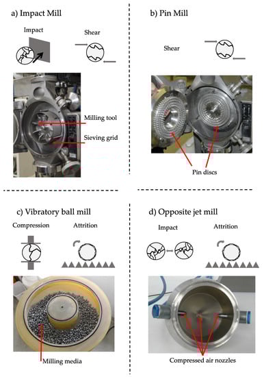Milling chambers of different devices and their main mechanical stresses: (a) impact mill, (b) pin mill, (c) vibratory ball mill and ppposite jet mill used for fine milling (a,b), and ultrafine milling (c,d) of biomass.