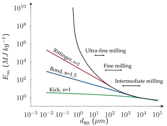 with n = 1 for Kick’s law, n = 1, 5 for Bond’s law, and n = 2 for Rittinger’s law. Hukki postulated later that n is not constant and depends on the particle size [], as illustrated in the Figure 2. The aim of this figure is to show that the total energy consumption increases greatly as the particle size decreases and that the different models can fit more or less the energy consumption according to the range of milling considered.