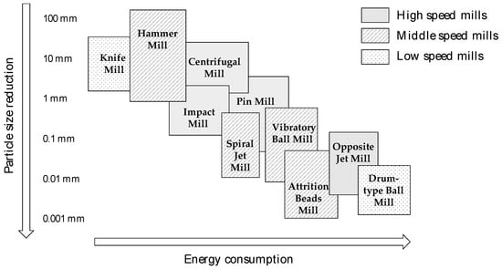 Classification of different milling equipment based on the energy consumption, the particle size reduction capacity, and the speed of milling, from different research works [,,,,,,,,].