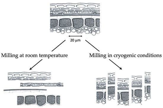 Grinding/milling samples in cryogenic conditions, generally using liquid nitrogen (0 to −196 °C), is a current technique to obtain very finely divided and stabilized vegetal samples for analytical characterization. Low temperature conditions embrittle the materials and also inactivate enzyme activities in fresh plants. At larger scale, a few examples of studies on cold grinding of plant-sourced materials are reported. Hemery et al. (2011) ground wheat bran in a high-speed impact mill operated with a liquid nitrogen-cooled feeder []. A 50 µm target particle size was reached with approximately three-fold less mechanical energy input compared to ambient temperature. Interestingly, the composition of particles differed depending on grinding temperatures: the multi-layered composite structure of bran ended up in particles from cryogenic conditions, denoting a random distribution of crossing cracks during the process, whereas the mechanical load in ambient conditions caused a concomitant breakdown and dissociation of the tissue layers, leading to a variety of distinct particle compositions as illustrated in the depiction of Figure 4. It was hypothesized that, at low temperature, all tissues exhibit identical mechanical properties, then bran behaves like a single vitreous material, while at ambient temperature, tissues differ in their elasto-plastic properties which results in the detachment of the layers under the mechanical stress. It was observed that lipids in the so-called testa bran layer exhibited a glass-transition temperature around −50 °C, which is consistent with a differential susceptibility to grinding []. Silva (2013) observed that processing wheat straw at −100 °C in a sieve-based impact grinder reduced the size of particles by ~20% further than at ambient temperature, whereas a ~45% improvement was obtained in a ball-mill []. This was attributed to a fast ejection from the milling chamber through the sieve in the first case because of the elongated shape of straw particles. Cryogenic conditions also had the advantage to correct the negative milling effect of high moisture content (~20%) by freezing absorbed water and then removing its plasticizing effect. However, due to the limited gains obtained, cryo-milling was not considered worthwhile for straw fine milling, considering the investments and functioning costs. In the industry, cryo-milling is reserved for processing matters ending to rather high added-value products, for example, adhesives and waxes to avoid deformability and stickiness, explosive materials to keep temperatures below the ignition range, spices to improve the retention of etheric oils and the prevention of oxidation and rancidity, together with higher throughputs and mechanical power savings.