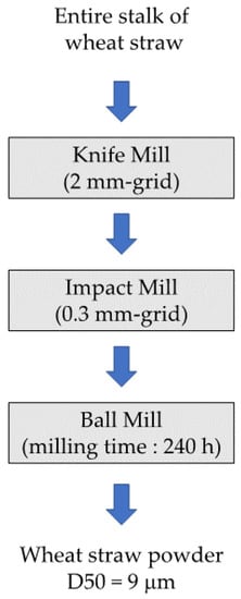 In order to help the reader in the process of selecting a grinder, we present here an example of a diagram process (Figure 5) for the ultrafine milling of wheat straw for bioethanol production and bio-composite for packaging application by explaining at each step the technological choices made in regard to the specifications [,].