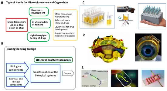 The similarities and diversities of micro-bioreactor design. (A) MBRs and OoCs have distinct purposes, which are expressed as user needs and requirements, e.g., the device should generate data for more economical manufacturing, safer and more efficient drugs, low cost for development, and support for medical research; (B) Despite the diversity in needs, a common transformation process can be outlined; (C) This is shared for MBRs used for process development; (D) for artificial liver bioreactors; and (E) for small plastic chips with multi-channels and internal membranes.