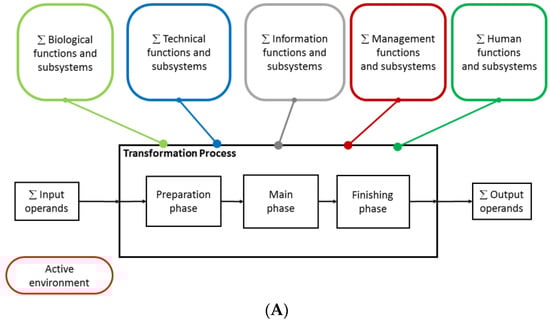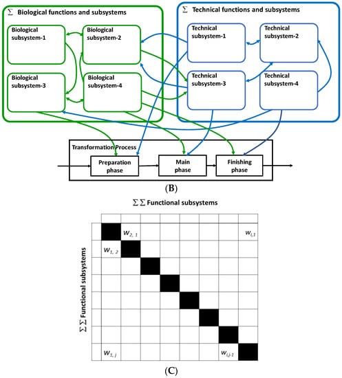 (A) Overall Hubka-Eder map showing the transformation process and functional systems; (B) a zoom-in of the biological and technical subsystems and their interactions in between and with the transformation process phases; and (C) the interaction matrix with assessed interaction effects between subsystems.
