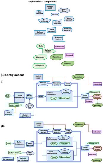 The Hubka-Eder mapping and the interaction analysis facilitate identification of essential functional components necessary for the design of the prototype []. Figure 4A shows a collection of 17 functional components suitable for the design of an MBR prototype, with the functional components grouped in the function systems from the HE-map. Note that a functional component is solely a conceptual object capable of carrying out the function, not a defined physical component, such as a valve or a pump. For example, a fluidic transporter only tells what you want the component to do, not if it is produced by pumping, using a syringe, or utilizing gravitational force. These “neutral”, non-physical, or non-real components allow one to investigate how the functions can be configured. Figure 4B shows two examples of configurations from the 17 functional components. In one configuration (I), cells are transferred to a temperature-controlled space in which the biological systems are preserved in several separately contained and temperature-controlled units with sensor functions. In the other configuration (II), all units are placed in the same temperature-controlled unit, and sensors are shared between the contained cell units. Theoretically, the 17 functional components in Figure 4 can be combined in a multitude of configurations, most of them unrealistic, but a few are realistic and worth investigating further.