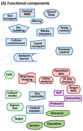 Based on this analysis, 16 functional components can be identified that need to be available when configuring the design. Figure 6A shows the functional components for containment, mixing, infusion of media, real-time data sampling, and transportation. The components of the biological functions are limited to the function of the cell line to express IgG, the gene function components, and the functions of the culture medium to enhance growth and IgG production. Information components are the information per se and the devices that can generate the information. The management components are software and instructions and rules to be followed. The humans are the individuals able to carry out the functions. These 16 components can easily be arranged in more than ten plausible and realistic configurations. Figure 6B shows two of these configurations, both close to existing MBR products [,].