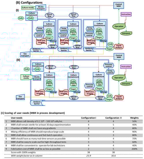 (A) Functional components for conceptual design of a MBR for bioprocess development; (B) Two configurations of these functional components; (C) Comparison and ranking of these two configurations versus user needs in Table 4 in which scores are calculated for weight factors all 100% or as in last column in the table.