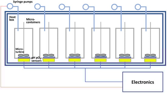 Blueprint of a prototype based on the ranking of components towards the need specifications. An MBR setup with six independent reactors for culture of CHO cells in 2–5 mL scale contained in a thermostat box. Sensors for pH and pO2 measure online in each MBR.