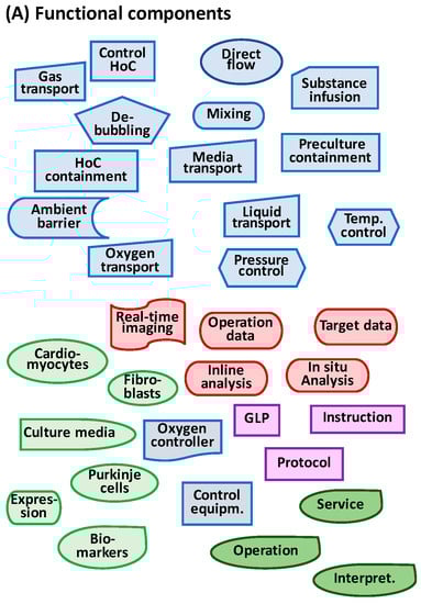 Clearly, there are many similarities between the user needs for a HoC device shown in Table 5 and the previous MBR design for process development (Table 4). However, the requirements on the biological systems are in the HoC more demanding due to the complex tissue architecture of the cardiac tissue. The minimal tissue equivalent, i.e., the smallest number of cells that can recapitulate the active in vivo heart tissue unit, which must be defined and realized in the HoC chambers, is a key issue in the prototype design. Also, supportive cells, e.g., fibroblasts and nerve cells for synchronized contraction (Purkinje cells), and the structure of the myocardial extracellular matrix (ECM) should be a part of that equivalent. The interaction with the culture media plays, in this respect, a critical role in maintaining the cells’ responses. The technical system functions as described in the previous MBR example remain largely unchanged for a HoC prototype, but are required to be extended with electrical or optical measurement functions for recording the contractions of the cell clusters. The information functions should, in the HoC, include methods to analyze the motility of the cells or cell clusters.