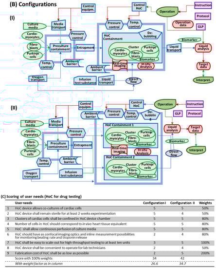 From the HE-map, the functional components related to the biological subsystems, i.e., cells and tissue functions, are identified (Figure 9A). These components can be arranged in a multitude of configurations (Figure 6B shows two possibilities of configurations). The upper configuration (I) is a design in which all cell types are confined in one body and these bodies are contained in the chip. The lower configuration (II) is a design based on parallel containment units in which cardiac bodies are kept apart. Additional configurations are, in this HoC application, more motivated to generate due to the extended complexity of the biological systems (not shown here) When comparing the two configurations in Figure 6 with the specification results in a ranking (with w = 1.0), which favors Configuration II when using the same weights for all need attributes (Figure 6C). Interestingly, if the weights are differentiated according to the importance of the need attributes, the ranking order remains.