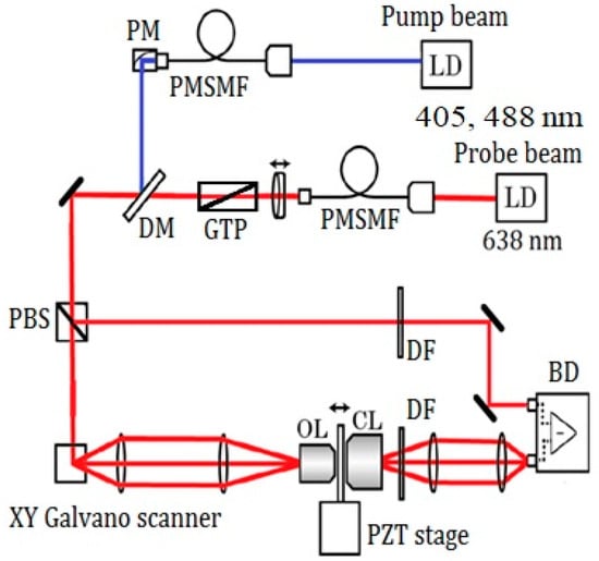PTM, which is based on the detection of changes to probe light intensity by thermal lensing due to local heating of the sample by absorption of the laser light, has demonstrated potential for biological imaging and clinical application. The key advantages of PTM are its high sensitivity and lack of a requirement for staining [,,,,,]. It facilitates the real-time, high-resolution imaging of nanometer-sized absorbers buried among light scatterers with a high signal-to-noise ratio [,,]. However, the PT signal intensity in normal PTM has two extremes in the axial direction [], which introduces distortions resulting in limited axial resolution of three-dimensional PT images. Confocal PTM (CPTM), which has a detection scheme similar to that of confocal microscopy, can help to ameliorate this drawback and improve the axial resolution []. Our group has used CPTM to study super-resolution microscopic images of neurons in mouse brains [,] and mouse skin MM [].