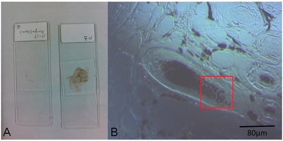 (A) Photo of the prepared specimens; (B) Charge coupled device (CCD) image of a nevus (10× objective lens). The red square area corresponds to the range of the photothermal (PT) image of Figure 3B.