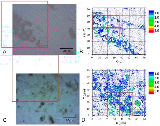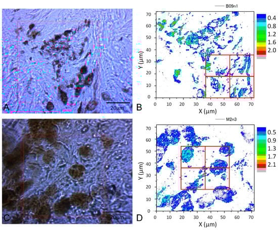 CCD images of a nevus (A) and malignant melanoma (MM) (C) (40× objective lens) and corresponding PT images (B,D) from the red squares obtained with a 405 nm pump. Four equal size (18 × 18 μm2) areas (red squares in (B,D)) were used for Grey Level Cooccurrence Matrix (GLCM) analysis.