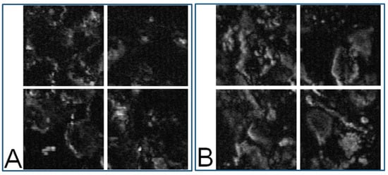(A): Eight-bit gray level PT image of a nevus sample (40× objective). The four images correspond to the four segmented areas represented by the four red squares in Figure 4B; (B): MM sample (40× objective). The four images correspond to the four segmented areas represented by the four red squares in Figure 4D.