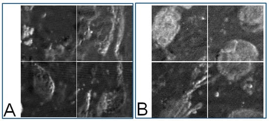 (A): Eight-bit gray-level PT image of a nevus sample (40× objective). The four images correspond to the four segmented areas represented by the four red squares in Figure 3B; (B): MM sample (40× objective). The four images correspond to segmented areas separated by the four red squares in Figure 3D.