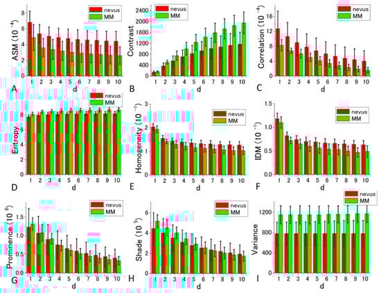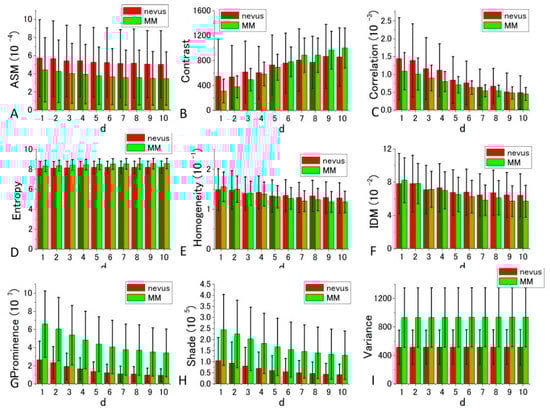 Figure 7 and Figure 8 depict bar charts of the nine averaged calculated distance parameters d = 1–10 (corresponding to the shift distance 120–1200 nm of the image in GLCM calculations) [,] and their standard deviations (SDs). In the graph, the bar is the SD of corresponding parameters calculated for the four sets of the image data shown in Figure 5 and Figure 6.