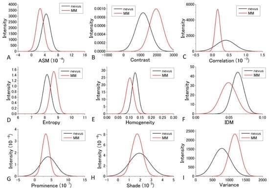 For the diagnosis, we used Figure 7 and Figure 8 for each GLCM parameter for d = 10. We obtained the Gaussian curves fit to the data with the peaks and the widths being the mean and the SD values respectively in the histograms for d = 10 in Figure 7 and Figure 8 for each GLCM parameter; these data are shown in Figure 9 and Figure 10.