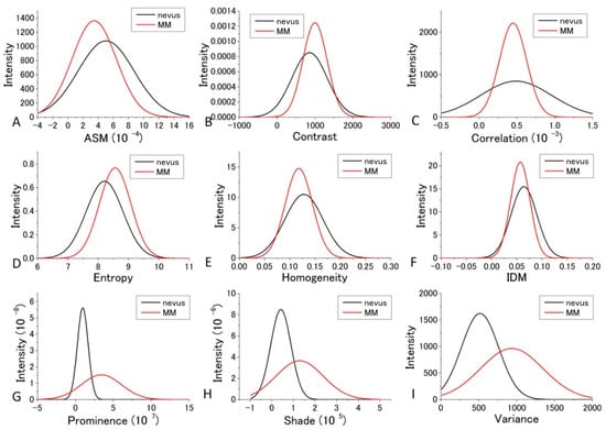 From the above orders of the DIF values in Supplementary Tables S3 and S5, it can be concluded that Entropy, Contrast, and Variance are most suited for the discrimination between MM and nevus cells in 405 nm excitation. For Entropy and Contrast, the distance parameter d = 10 gives the highest DIF of 1.879 and 1.847, respectively, and for Variance, d = 2 produced the largest value, although it was not substantially larger than those of other values of d. The probabilities of correct identification of nevus cells were 39.49%, 39.21%, and 39.49% for Entropy (d = 10), Contrast (d = 10), and Variance (d = 10), respectively, while the probabilities of correct identification of MM cells were 39.49%, 39.21%, and 39.49% for Entropy (d = 10), Contrast (d = 10), and Variance (d = 10), respectively. These values are much more accurate than those obtained by fractal analysis [,,,,,].