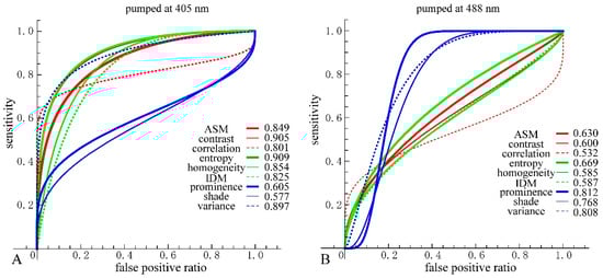 As shown in Supplementary Table S1, Variance, Entropy, and Contrast had large AC and LR+ values and a small LR− value, indicating that these three GLCM parameters are more reliable than the other GLCM parameters at 405 nm excitation. In the case of 488 nm excitation, as tabulated in Supplementary Table S2, Prominence, Shade, and Variance had large AC and LR+ values and a small LR− value, indicating that these three GLCM parameters are more reliable than the other GLCM parameters.