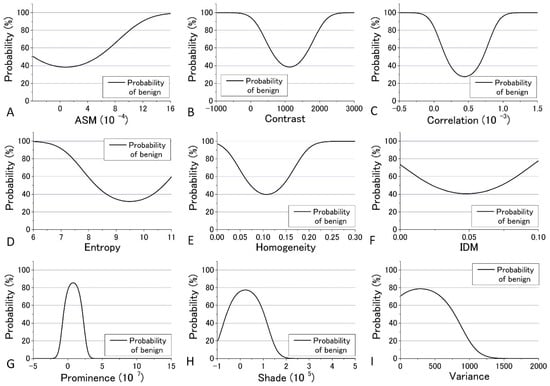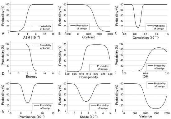 In the previous analysis, DIF was calculated using the average of the parameters obtained from the four images which contain 48 raw images. The calculated values of DIF for the nine GLCM parameters are shown in Table S6. To further utilize the parameters obtained by the GLCM analysis, we assessed them by taking the dispersion of the distribution of the parameters into account. The mean and distribution (=dispersion) were fitted with a Gaussian distribution as shown in Figure 9 and Figure 10 for all nine parameters. These figures show that the values of the parameters are widely distributed and depict that the degree of overlap between the nevus and MM cells are different among the parameters. Using the distribution function, the probability of benign (defined by B = Benign/(Benign + Malignant)) was then calculated and plotted against the parameter values for the distance d = 10. The results are shown in Figure 12 and Figure 13.