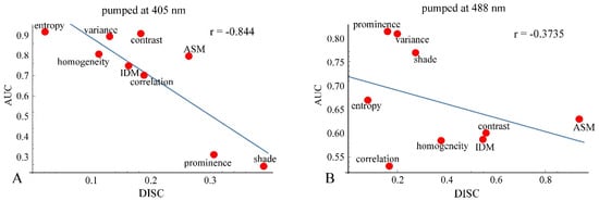 As mentioned previously, analyses of ROC and DIF agreed quite well at both 405 nm and 488 nm. However, there were some differences between the analyses results of ROC or DIF and DISC, especially at 488 nm excitation. The correlation diagrams between AUC and DISC at 405 nm and at 488 nm excitation are shown in Figure 14. The correlation coefficient at 405 nm excitation was −0.844, indicating a strong correlation, and at 488 nm excitation, it was −0.3735, showing a weak correlation.