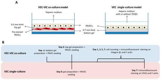 Collagen-elastin gels were prepared with 50% bovine type I collagen solution (from a 6 mg/mL stock, Advanced Biomatrix, Carlsbad, CA, USA), 12% elastin solution made from sterile 5 mg/mL stock solution (Sigma-Aldrich, St. Louis, MO, USA), 10% PBS (10×), and the balance completed with equal parts of DMEM and FBS. Final concentrations of collagen and elastin in the gel were 3 mg/mL (w/v) and 0.6 mg/mL (w/v). After adjusting the pH with 1 M sterile sodium hydroxide to 7.5, the solution was transferred to 37 °C under a humidified atmosphere and 5% CO2 and allowed to gel for 1 h. Both VEC-VIC co-culture and VEC single-culture models were created using these gels, as shown in Figure 1A. The timeline of the entire culture period of each model is described in Figure 1B.