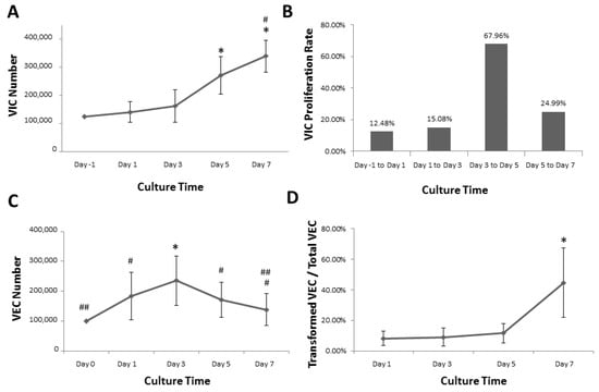 (A) VIC counts in 3D VEC-VIC co-culture model. * p < 0.05, comparing with seeding, day 1, and day 3; # p < 0.05, comparing with day 5; (B) VIC proliferation rates in 3D VEC-VIC co-culture model. (C) VEC counts in 3D VEC-VIC co-culture model. * p < 0.05, comparing with seeding, day 1, day 5, and day 7; # p < 0.05, comparing with seeding; “##” indicating day 7 not significantly different from seeding; (D) Ratios of transformed VECs over total VECs. * p < 0.05, comparing with day 1, day 3, or day 5.
