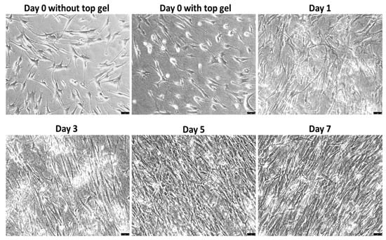 Phase-contrast images of VICs showing cell elongation and alignment with time. Scale bar: 50 μm.