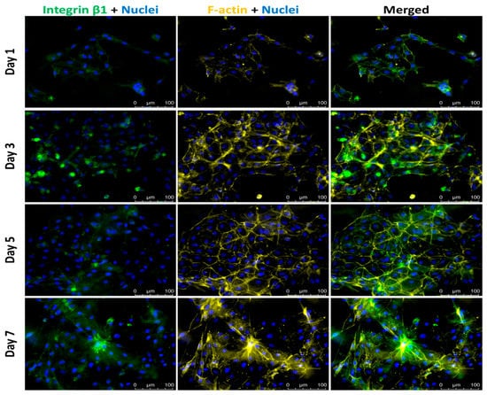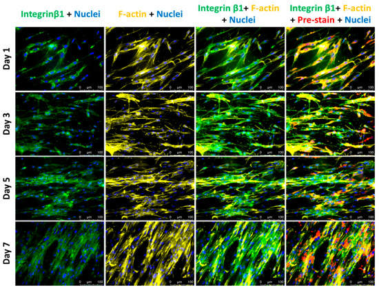 Culture confluence reached approximately 70% by day 5 and further increased to over 90% on day 7, as shown in Figure 3. Additionally, more cells aligned in highly confluent cultures. On later days in culture, cells aligned in parallel with each other, along their long axis, potentially due to collagen fiber orientation (Figure 3). This behavior is not commonly observed in other cultures. Before the observation of cell alignment on day 3, cell elongation happened one day after assembling the 3D co-culture and this elongated cell morphology was maintained with increased culture confluence and cell alignment. The morphological changes in cell length and alignment were also observed in F-actin-labeled fluorescent images, as shown in Figure 4. The expression levels of integrin β1 and F-actin remained the same throughout the entire culture period, even though there seems to be a small increase in the number of actin fibers per cell in day 7 cultures.