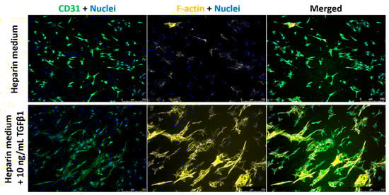 VEC behavior in single culture: On a separate experiment, we employed a VEC pure culture model, where VECs were seeded onto the top surface of collagen-elastin gels and cultured for 7 days. The effect of TGFβ1 on EndoMT was investigated in this single cell model to assess levels of phenotype markers (loss of CD31 and increase in F-actin, non-cortical) in TGFβ1-supplemented cultures (Figure 6). After 7 days in culture, untreated VECs maintained their original CD31-positive phenotype, while the expression of F-actin was undetectable in the majority of the cells (Figure 6). However, in TGFβ1-supplemented cultures, cells showed more prominent actin filaments with reduced expression of CD31, indicating the occurrence of EndoMT (Figure 6). Along with the differential expression of protein markers, VECs cultured with heparin medium sustained the cobblestone endothelial morphology. With the presence of TGFβ1, VECs were elongated to more spindle-shaped morphology. However, VEC did not easily migrate into the gel matrix.