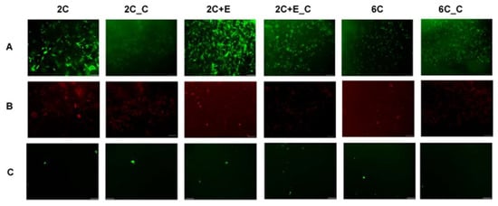 Live/dead assay images depict (row A) live and (row B) dead cells in various hydrogel conditions on day 7. Uptake of acetylated LDL (green) by cells cultured in various hydrogels on day 7 is shown in row C. Scale bars = 100 µm. 2C: 2 mg/mL collagen; 2C_C: the 2C hydrogel cross-linked with EDC/NHS; 2C+E: 2 mg/mL collagen added with 6 mg/mL ELP2; 2C+E_C: the 2C+E hydrogel cross-linked with EDC/NHS; 6C: 6 mg/mL collagen; and 6C_C: the 6C hydrogel cross-linked with EDC/NHS.