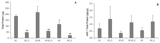 (A) Total protein and (B) normalized vWF levels (vWF/Total Protein) of cells cultured in various hydrogel conditions on day 7: 2C: 2 mg/mL collagen; 2C_C: the 2C hydrogel cross-linked with EDC/NHS; 2C+E: 2 mg/mL collagen added with 6 mg/mL ELP2; 2C+E_C: the 2C+E hydrogel cross-linked with EDC/NHS; 6C: 6 mg/mL collagen; and 6C_C: the 6C hydrogel cross-linked with EDC/NHS. Bars show the average + upper 95% confidence interval. Statistical analysis performed by ANOVA. * indicates p ≤ 0.05 and ** indicates p ≤ 0.01 against the 2C hydrogel. n ≥ 8.