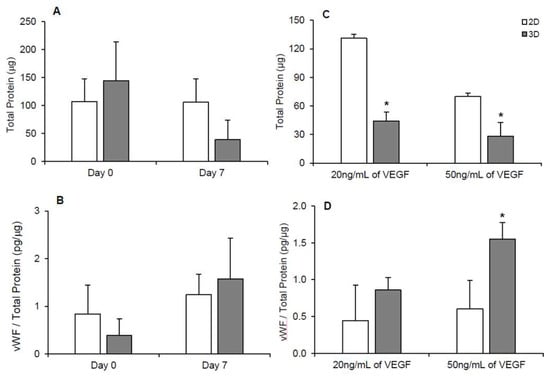 (A) Total protein content and (B) normalized vWF levels (vWF/total protein) of cells cultured in the scaffold-free 2D and 3D conditions without any additional VEGF supplementation on days 0 and 7. (C) Total protein content and (D) normalized vWF levels (vWF/total protein) of cells cultured in the scaffold-free 2D and 3D conditions on day 7 with the addition of VEGF. Bars show the average + upper 95% confidence interval. Statistical analysis performed by ANOVA. * indicates p ≤ 0.05. n ≥ 7.