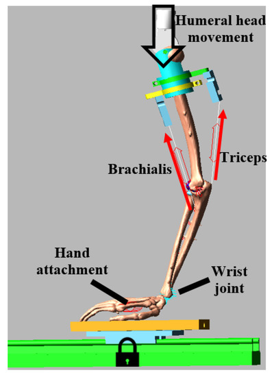 - An, K.N.; Hui, F.C.; Morrey, B.F.; Linscheid, R.L.; Chao, E.Y. Muscles across the elbow joint: A biomechanical analysis. J. Biomech. 1981, 14, 659–669. [Google Scholar] [CrossRef]