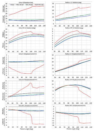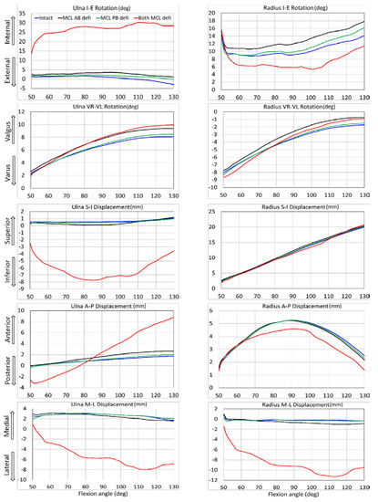 Effect of medial collateral ligament deficiency on ulna and radius kinematics relative to humerus for specimen 1.