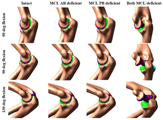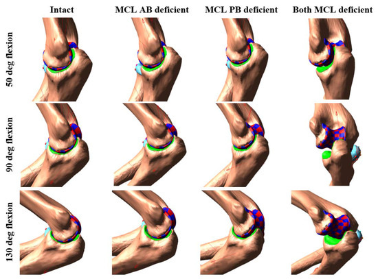 The primary objective of this study was to investigate medial collateral ligament deficiency of the elbow joint in computational multibody model simulation. Four cases were simulated in this study: (i) Keeping all ligament intact (‘Intact’ model); (ii) isolated MCL anterior bundle deficiency (MCL AB deficient); and (iii) isolated MCL posterior bundle deficiency (MCL PB deficient) (iv) and combined MCL anterior and posterior bundle deficiency (Both MCL deficient). For each ligament deficiency condition, kinematics, contact area, contact pressure, and ligament forces were calculated and compared to the intact model simulation.