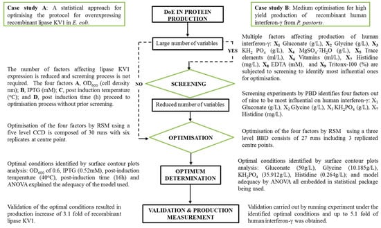 A typical DoE workflow in protein production. Case study A illustrates the optimization of recombinant lipase KV1 expression in E. coli [] where a screening process was not required since the number of factors affecting this enzyme is not large (four factors). The four factors (A, B, C, D), therefore, underwent optimisation by Central Composite Design (CCD) under Response Surface Methodology (RSM) which resulted in a yield increase in protein expression of 3.1-fold. Case study B describes the optimisation process for high yield production of recombinant human interferon-γ []. In this case, the number of factors involved is large (nine factors) and they were subjected to a screening process before optimisation. Four factors (X1, X2, X3, X7) out of nine were identified by Plackett-Burman Design (PBD) based screening to be the most influential and subsequently used for further optimisation. A Box-Benkhn Design (BBD) also under RSM was selected to optimize the screened factors and increased the production of human interferon-γ up to 5.1 fold. Further details of these two case studies can be found in the references provided and similar cases are found in Tables 4 and 7.