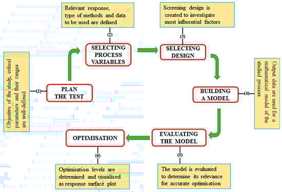 The screening process identifies most influential factors on the process under investigation (i.e., X1 and X6 in the example shown in Table 5) and thus paves the way for effective optimisation by reducing the number of factors to be optimised in the third work package of the DoE workflow [].