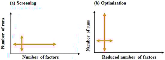 A comparative illustration of screening and optimisation designs. (a) In screening designs a large number of factors, with reduced number of runs, are used to screen for important factors affecting the process. (b) In optimisation designs, a reduced number of factors, with large number of runs, are utilised to find the optimum conditions for high yield of recombinant protein.